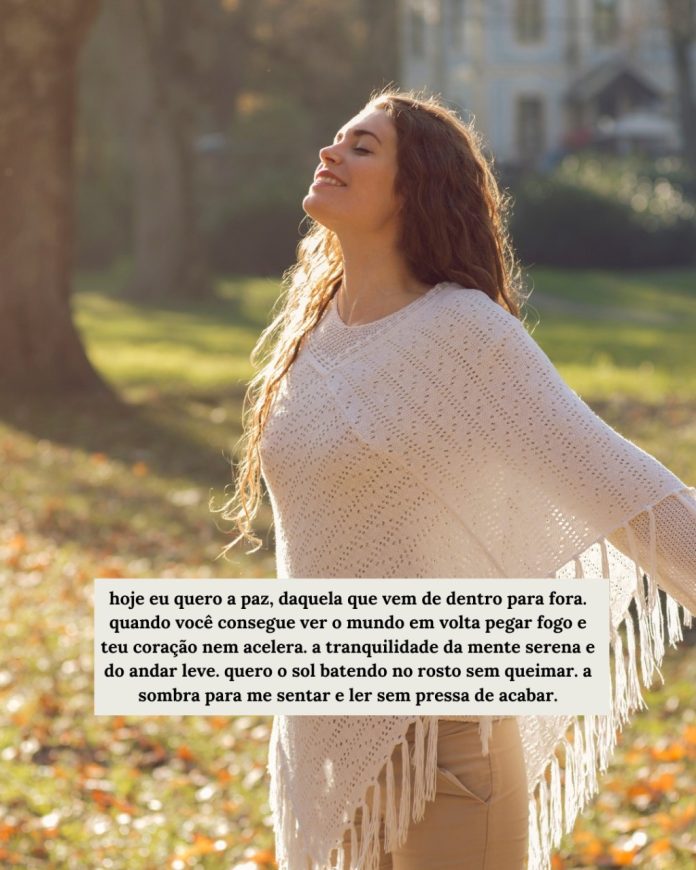 hoje eu quero a paz, daquela que vem de dentro para fora. quando você consegue ver o mundo em volta pegar fogo e teu coração nem acelera. a tranquilidade da mente serena e do andar leve. quero o sol batendo no rosto sem queimar. a sombra para me sentar e ler sem pressa de acabar.