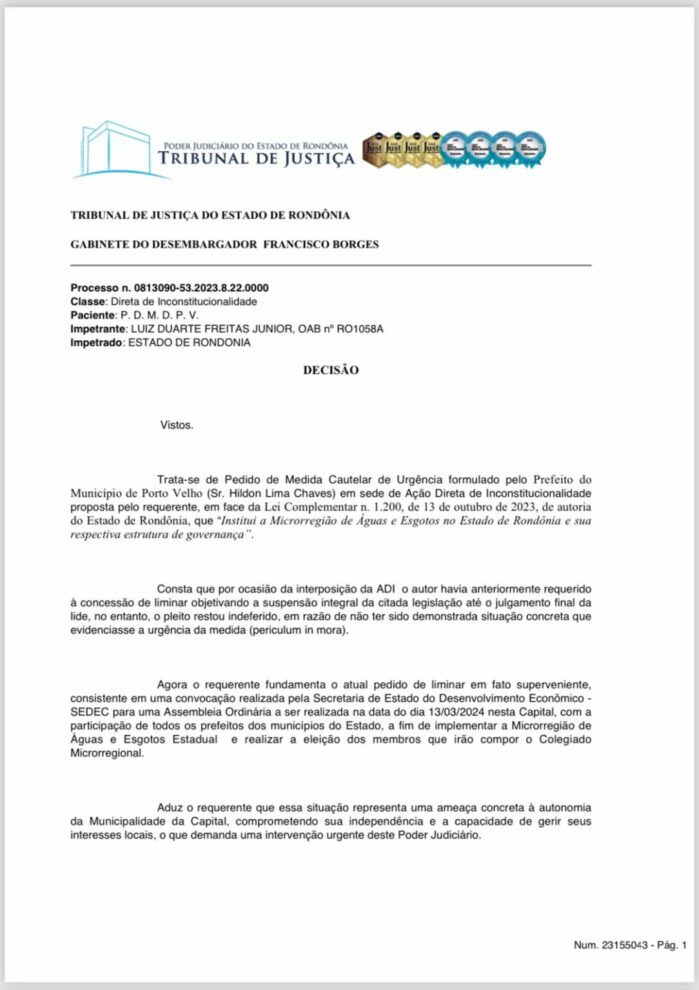 De acordo com a lei, para conseguir sair fora da Caerd o município precisava de autorização. O poder de mando maior estava com o governo, que precisava do voto de poucas prefeituras para conseguir impedir qualquer licitação, não importando o município. Acontece que agora o desembargador Francisco Borges concedeu liminar em ação direta de inconstitucionalidade movida pelo prefeito de Porto Velho, Hildon Chaves. A lei, aparentemente, é inconstitucional.