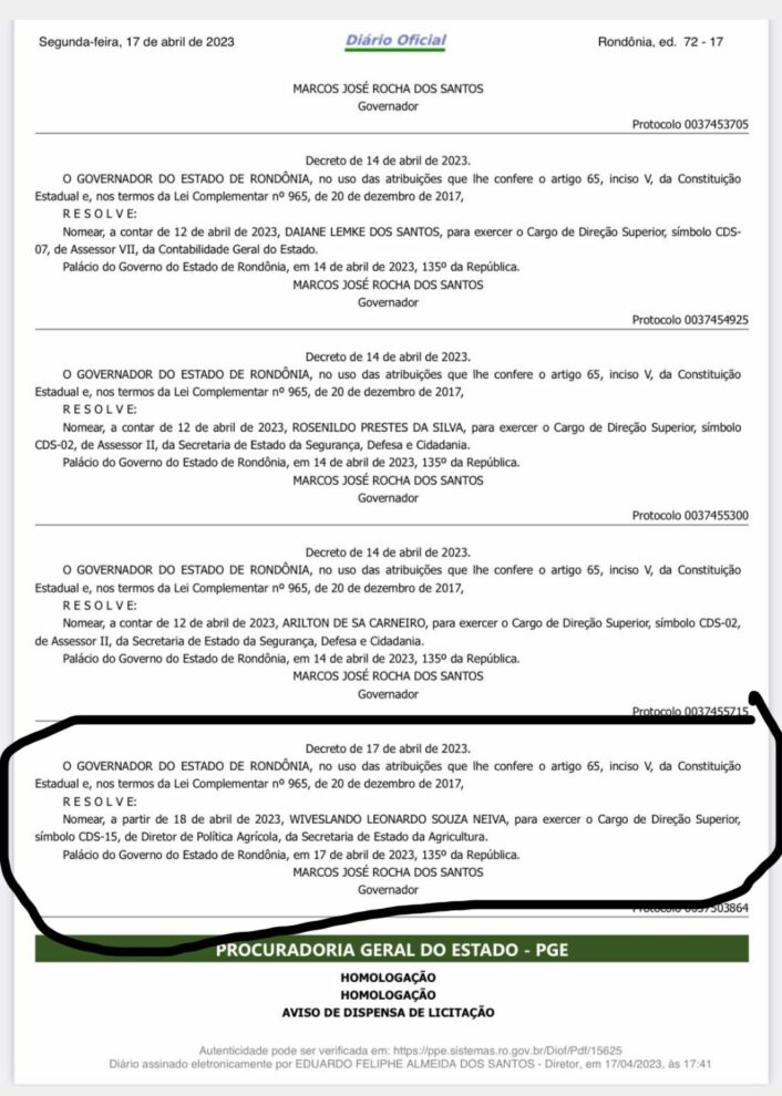 O caso é que o filho de Ezequiel Neiva, Wiveslando Leonardo da Silva Neiva, foi nomeado Diretor de Política Agrícola da Seagri, com os proventos totalizando R$ 18.607,10, com valor valor líquido de 13.819.07. O blog já havia noticiado o caso quando o rapaz viajou de férias, mesmo estando nomeado somente há seis meses.