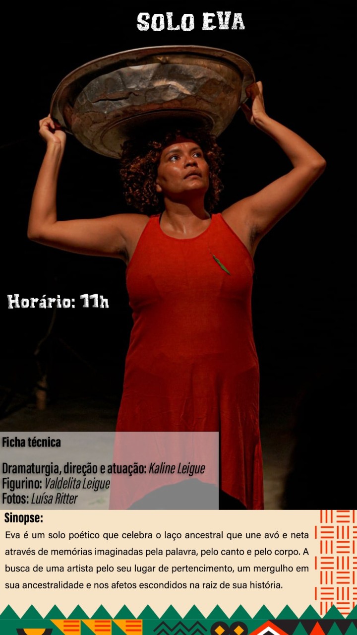 * 11h00: Solo teatral EVA, de Kaline Leique, explorando memórias ancestrais.