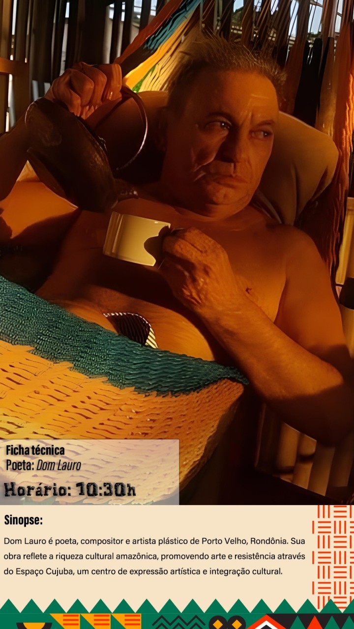* 10h30: Apresentação de Dom Lauro, poeta, compositor e artista plástico, celebrando a cultura amazônica por meio do Espaço Cujuba.