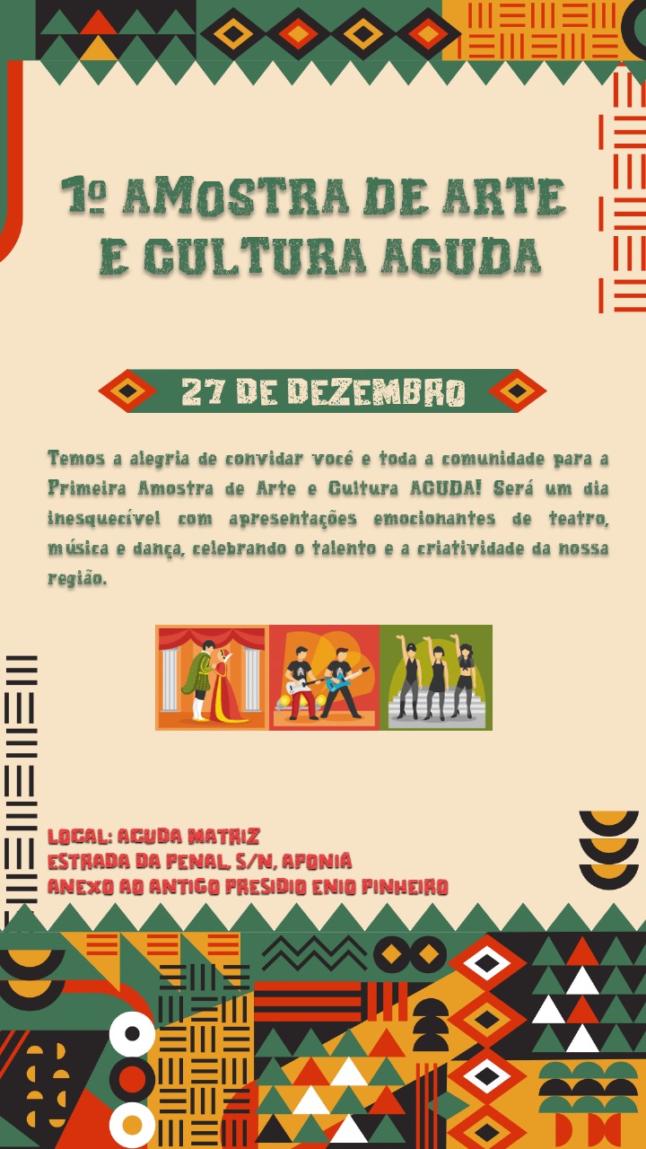 No dia 27 de dezembro, a Associação Cultural e de Desenvolvimento do Apenado e Egresso (ACUDA) realizará a 1ª Mostra de Arte e Cultura em Porto Velho. O evento acontecerá na sede da ACUDA, a partir das 10h30, e contará com uma programação diversificada, incluindo apresentações teatrais, recitais poéticos, exposições de artes visuais e um sarau cultural.
