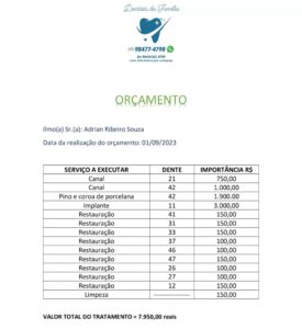 O orçamento foi feito no escritório Dentista da Família em Rolim de Moura, ficando o total em R$ 7.950,00.
