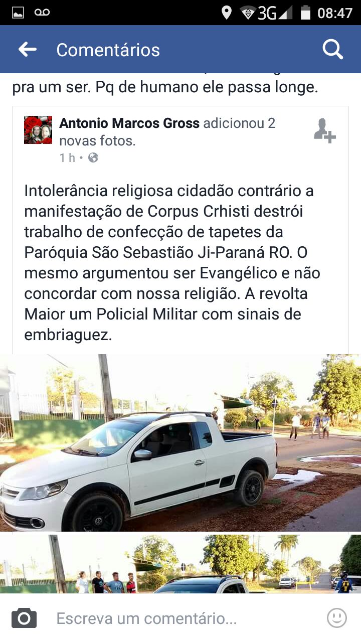 Na manhã deste feriado, no município de Ji-Paraná, um Policial Militar que estava de folga, entrou na Rua Das Pedras com seu veículo Saveiro, de placas NBF9687 e invadiu uma área que estava isolada com cavaletes da AMT. Visivelmente embriagado, o policial, identificado como Iago Beccária Santos, começou a praticar direção perigosa naquele local, colocando em risco a vida de dezenas de fiéis que confeccionavam os “tapetes” para a celebração do feriado.