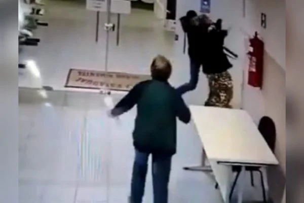O caso aconteceu dentro da escola e foi registrado por câmeras de segurança. As imagens mostram o momento em que o estudante conversa com a diretora e outras pessoas. Quando ela se vira para sair, o aluno parte para a agressão física.