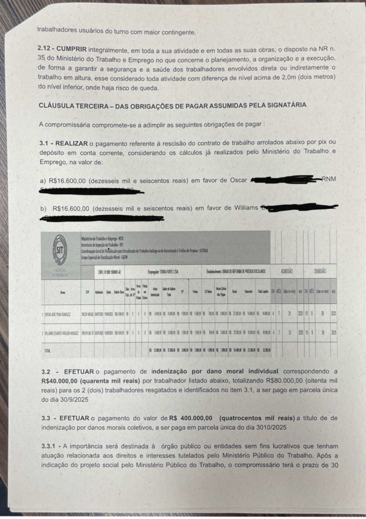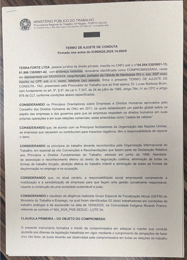 O Ministério Público do Trabalho (MPT) elaborou um TAC para ser assinado pela Terra Forte, obrigando Marcelo a pagar o que deve aos venezuelanos. No documento são apontadas as irregularidades, sendo possível entender um pouco das falcatruas do empresário. Ele recebe dinheiro da Seduc para cumprir as obrigações sociais e pagar os funcionários, e aparentemente desvia uma parte.