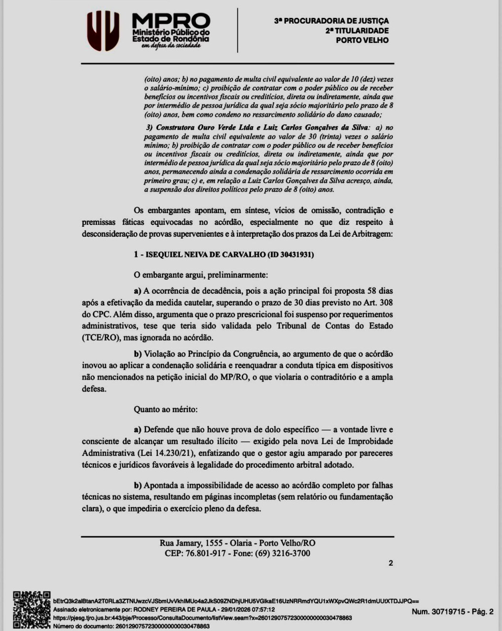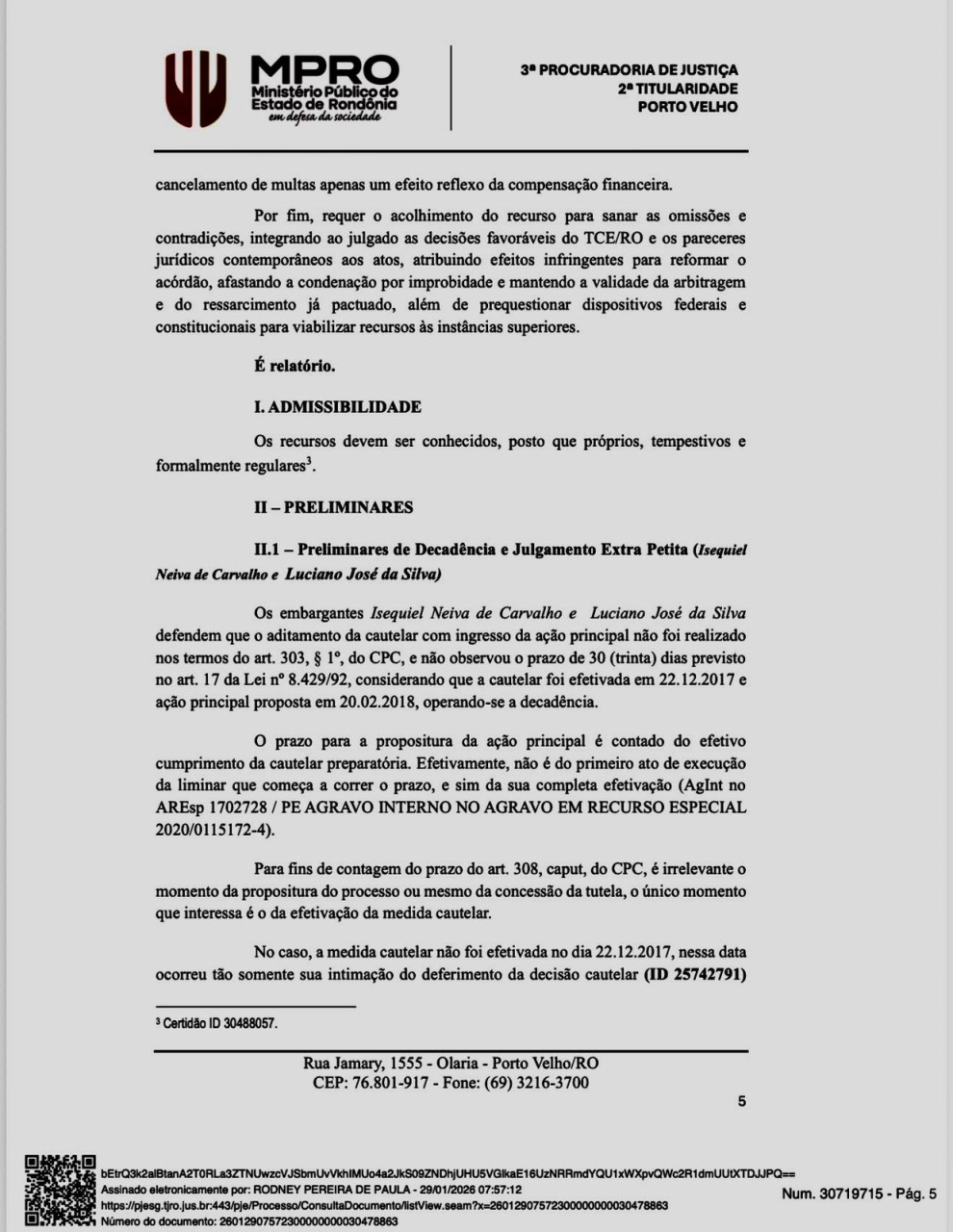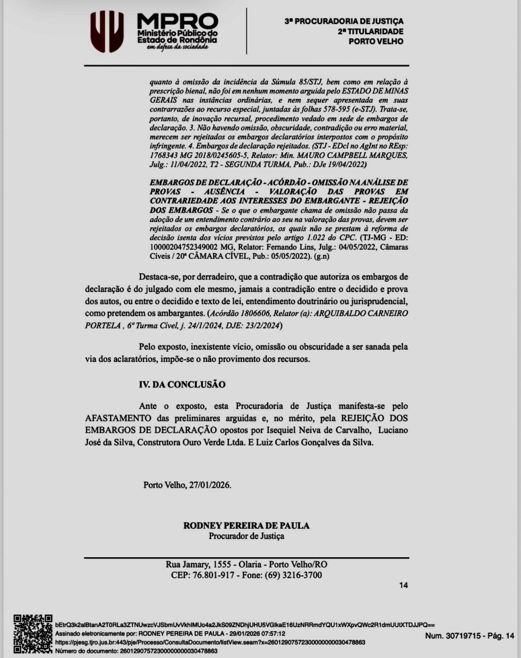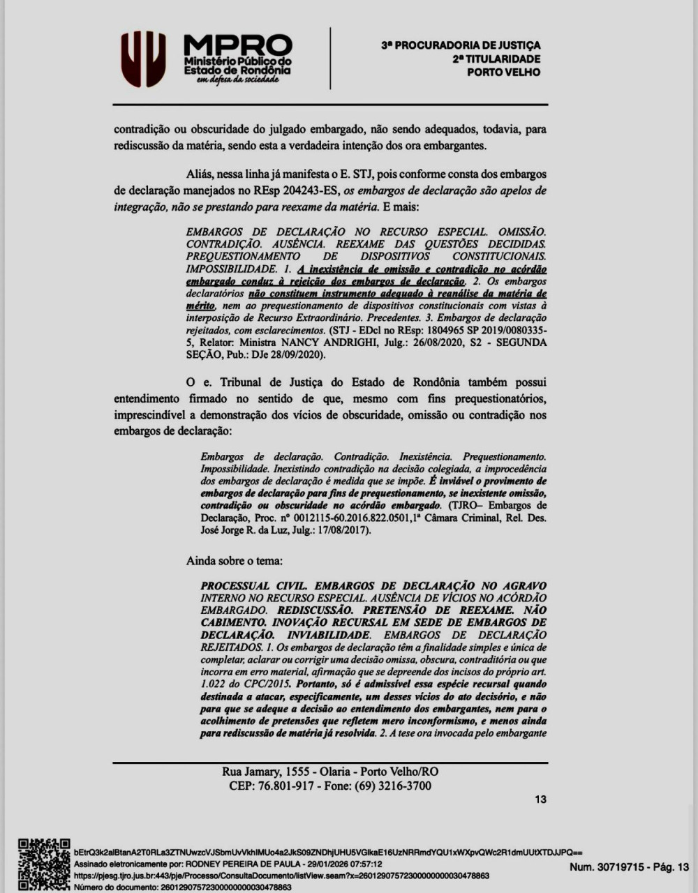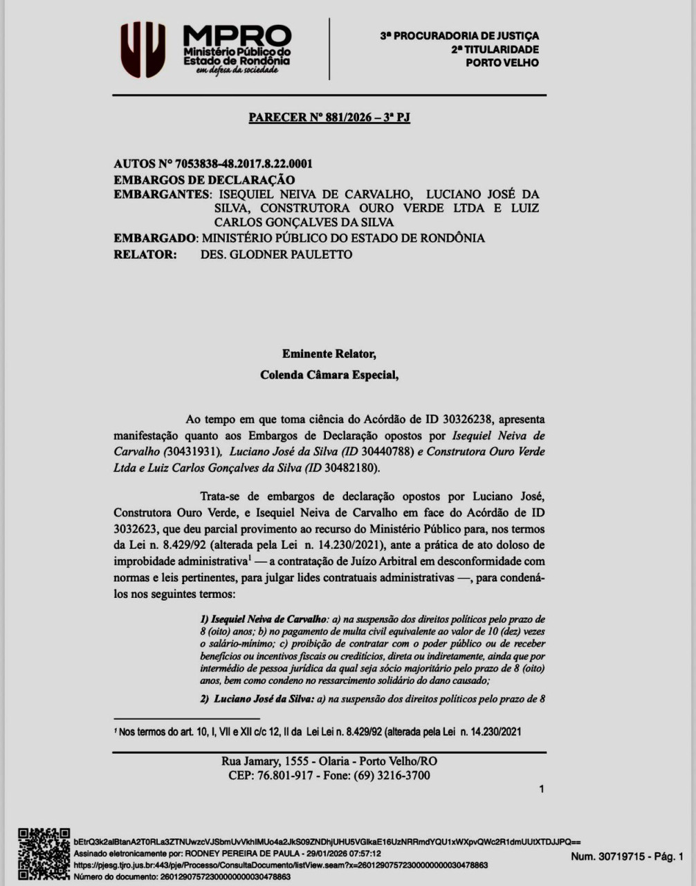 O Ministério Público do Estado de Rondônia apresentou parecer pela rejeição dos embargos de declaração (uma espécie de recurso) interpostos, entre outros, pelo deputado estadual Isequiel Neiva de Carvalho, conhecido politicamente como Ezequiel Neiva (União Brasil), no processo nº 7053838-48.2017.8.22.0001, em análise na 1ª Câmara Especial do Tribunal de Justiça de Rondônia (TJRO). A manifestação consta no parecer nº 881/2026 da 3ª Procuradoria de Justiça.