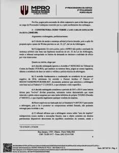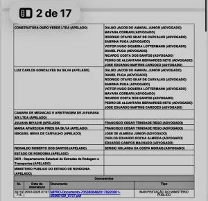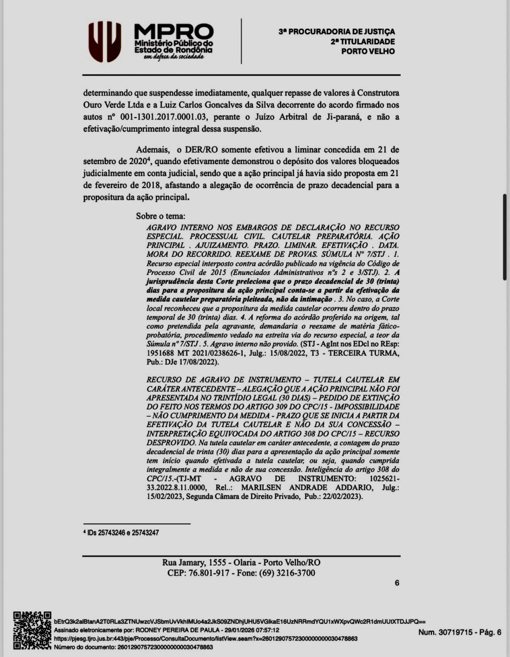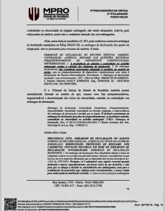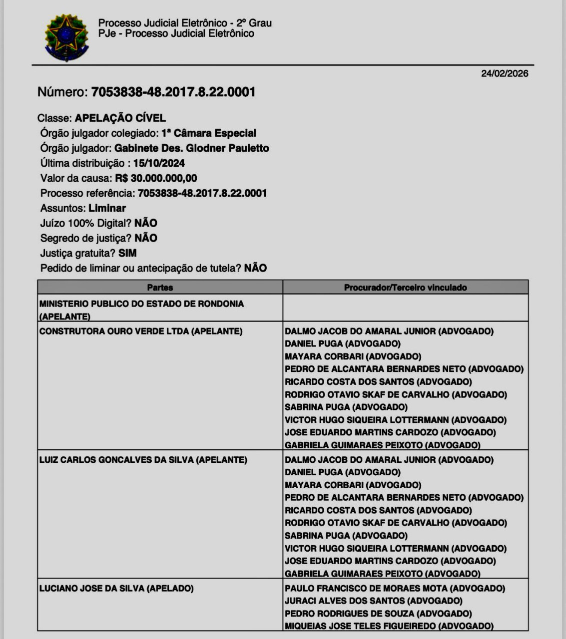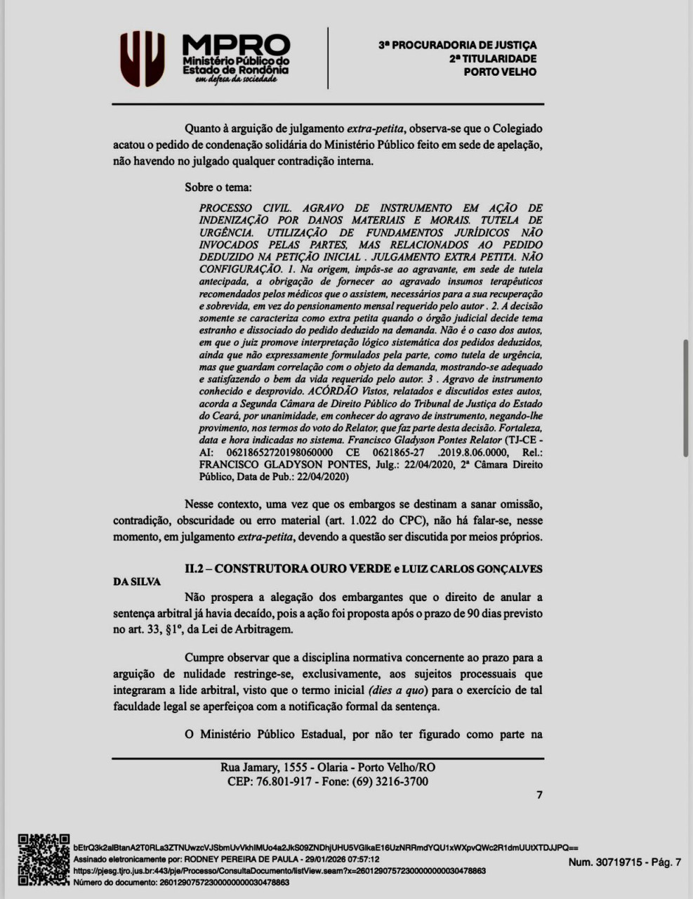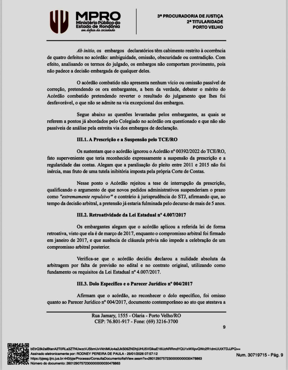 O Ministério Público do Estado de Rondônia apresentou parecer pela rejeição dos embargos de declaração (uma espécie de recurso) interpostos, entre outros, pelo deputado estadual Isequiel Neiva de Carvalho, conhecido politicamente como Ezequiel Neiva (União Brasil), no processo nº 7053838-48.2017.8.22.0001, em análise na 1ª Câmara Especial do Tribunal de Justiça de Rondônia (TJRO). A manifestação consta no parecer nº 881/2026 da 3ª Procuradoria de Justiça.