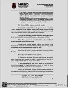 Embargos de declaração são um tipo de recurso utilizado quando uma decisão judicial apresenta omissão, contradição, obscuridade ou erro material. O objetivo é solicitar ao tribunal que esclareça ou complemente pontos da decisão, sem reexaminar o mérito da causa. No parecer, o Ministério Público sustenta que o instrumento não pode ser usado para rediscutir o resultado do julgamento.