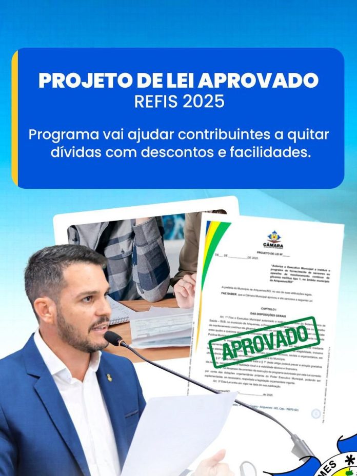 A Câmara Municipal de Ariquemes aprovou por unanimidade, nesta semana, o Projeto de Lei nº 3.706/2025, que institui o Programa de Recuperação Fiscal (REFIS 2025) no município. A proposta segue agora para a sanção da prefeita Carla Redano.