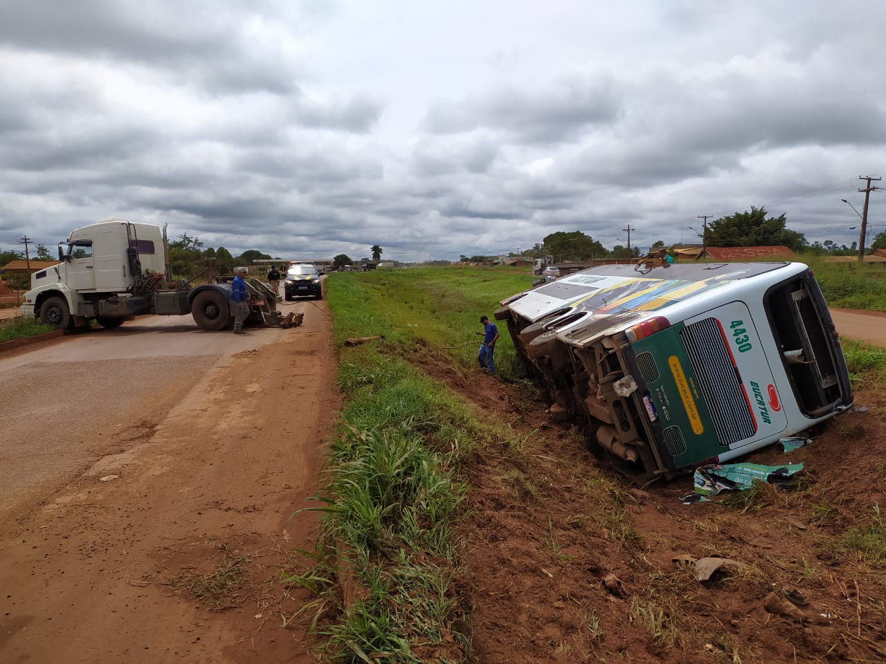Na madrugada desta quarta-feira (10), ocorreu um acidente, tipo tombamento, de uma carreta que transportava trigo ensacado. O local exato fica no Km 655 da BR 364, distante cerca de 60 quilômetros da Capital. O incidente gerou derramamento de carga, de combustível e o veículo esta tombado no leito da rodovia, desta forma, *o fluxo de veículos está totalmente interrompido e não há previsão de liberação da rodovia*.