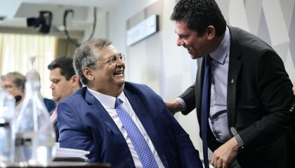 O senador Sergio Moro (Podemos-ES) e o ministro da Justiça Flávio Dino foram flagrados se abraçando e aos risos durante a sabatina na Comissão de Constituição e Justiça (CCJ) do Senado, nesta quarta-feira (13). A cena chamou a atenção porque os dois são ferrenhos críticos um do outro.