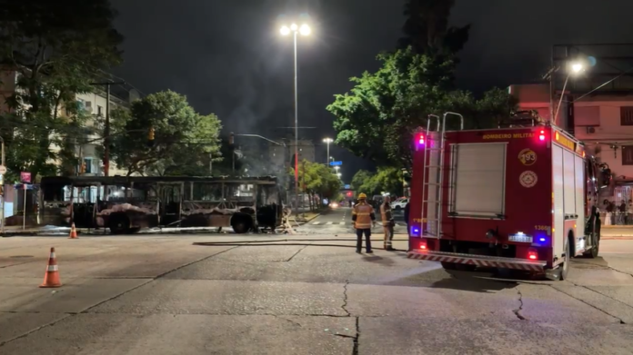 Um grupo de 50 pessoas bloqueou a avenida Princesa Isabel, em Porto Alegre, e ateou fogo em dois ônibus na noite deste domingo (19).