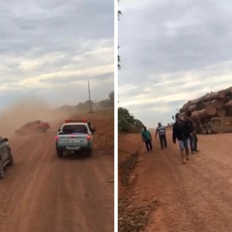 O vídeo acima mostra dois caminhões com toras de madeiras passando pela estrada, até que o grupo com vários veículos, atrapalha a passagem da viatura da Polícia Ambiental que estava escoltando os caminhões para uma área de segurança da polícia.