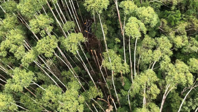 Imagem divulgada pela Polícia Militar mostra destroços do helicóptero em meio a vegetação fechada.