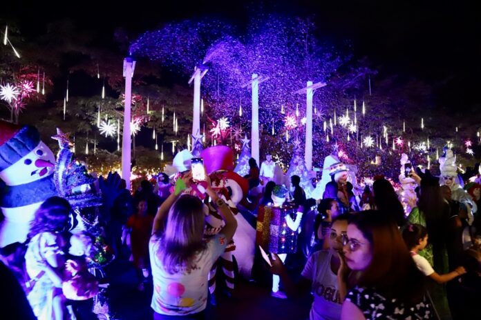 Além da árvore, decorada com luminária de LED azul e amarela, o espaço conta com túneis iluminados, caixas, entre outros, que somam mais de 3.500 componentes. O trabalho foi desenvolvido pela equipe da Empresa de Desenvolvimento Urbano (Emdur).