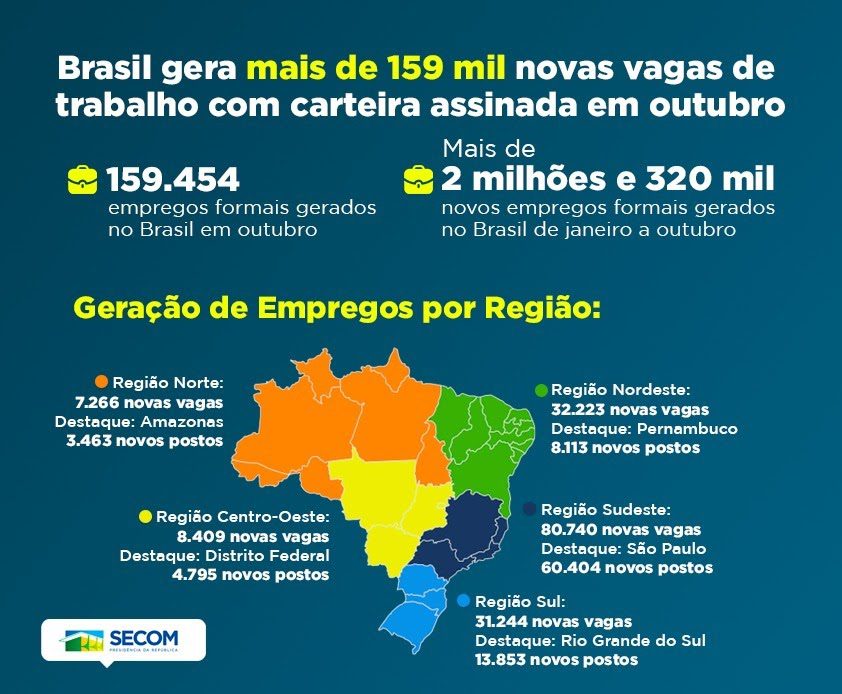 O Brasil manteve, em outubro, a tendência positiva na geração de empregos e fechou o mês com um saldo de 159.454 novos postos formais de trabalho. Com isso, o país acumula, entre janeiro e outubro de 2022, um saldo de mais de 2,32 milhões (2.320.252) de novas vagas e se aproxima da marca de 43 milhões de postos formais registrados no Novo Caged (42.998.607), quebrando, assim, mais um recorde histórico.