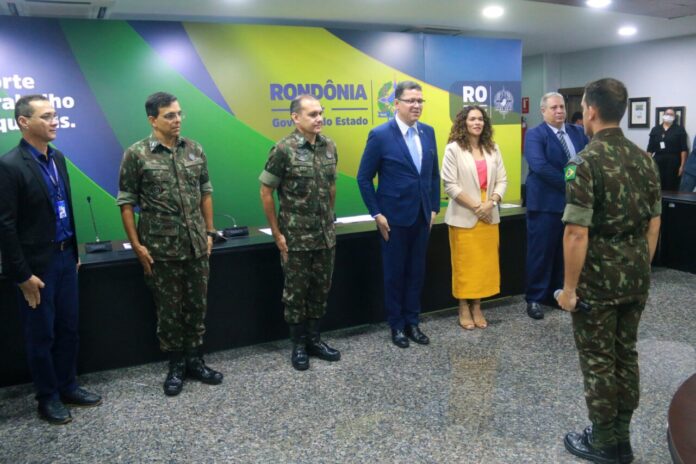 Nesta segunda-feira (27), no Palácio Rio Madeira, sede do Governo de Rondônia, o governador Marcos Rocha fez a entrega da maior condecoração do estado, a medalha da Ordem do Mérito Marechal Rondon, no grau grande oficial, ao general de brigada Flávio Moreira Mathias, comandante da 17ª Brigada de Infantaria e Selva, por relevantes serviços prestados ao estado, e ainda compartilhou a experiência como militar aos alunos que irão se formar em aspirante a oficial da reserva esta semana.