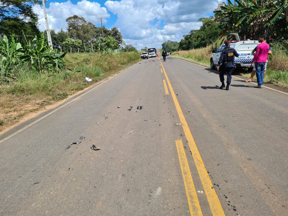 Um dos pés e outras partes do corpo de uma mulher, ficaram no asfalto após batida forte entre uma motocicleta e um veículo Volkswagen, modelo Gol, de cor branca, na RO-470, entre Mirante da Serra e Nova União (RO) nesta sexta-feira, 27 de maio.