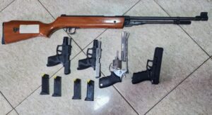 de aproximadamente R$ 100 mil em espécie, bem como sete armas de fogo, mais de 1.000 munições, 28 celulares lacrados, sem comprovação de nota fiscal, e diversas ampolas de anabolizantes.
