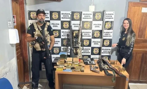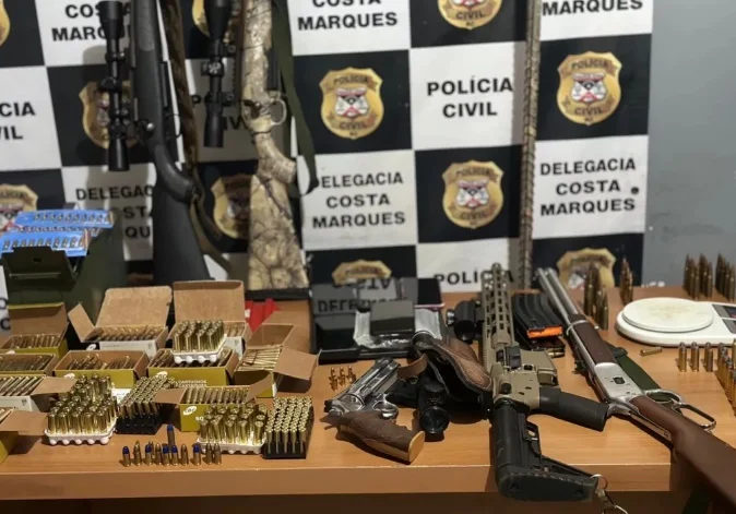 Ao amanhecer, a polícia cumpriu um mandado de busca e apreensão em uma propriedade nas imediações do Distrito de São Domingos do Guaporé. A operação resultou na apreensão de seis armas de fogo e cerca de 800 munições, além de lunetas de precisão e outros equipamentos de uso policial e militar.
