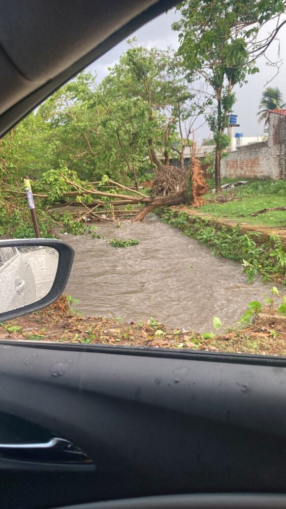 Na avenida Pinheiro Machado, uma árvore foi arrancada de suas raízes, caindo dentro de um canal que atravessa a região. Já na Jorge Teixeira, próximo à avenida Amazonas, outra árvore sucumbiu após ser atingida por um raio.