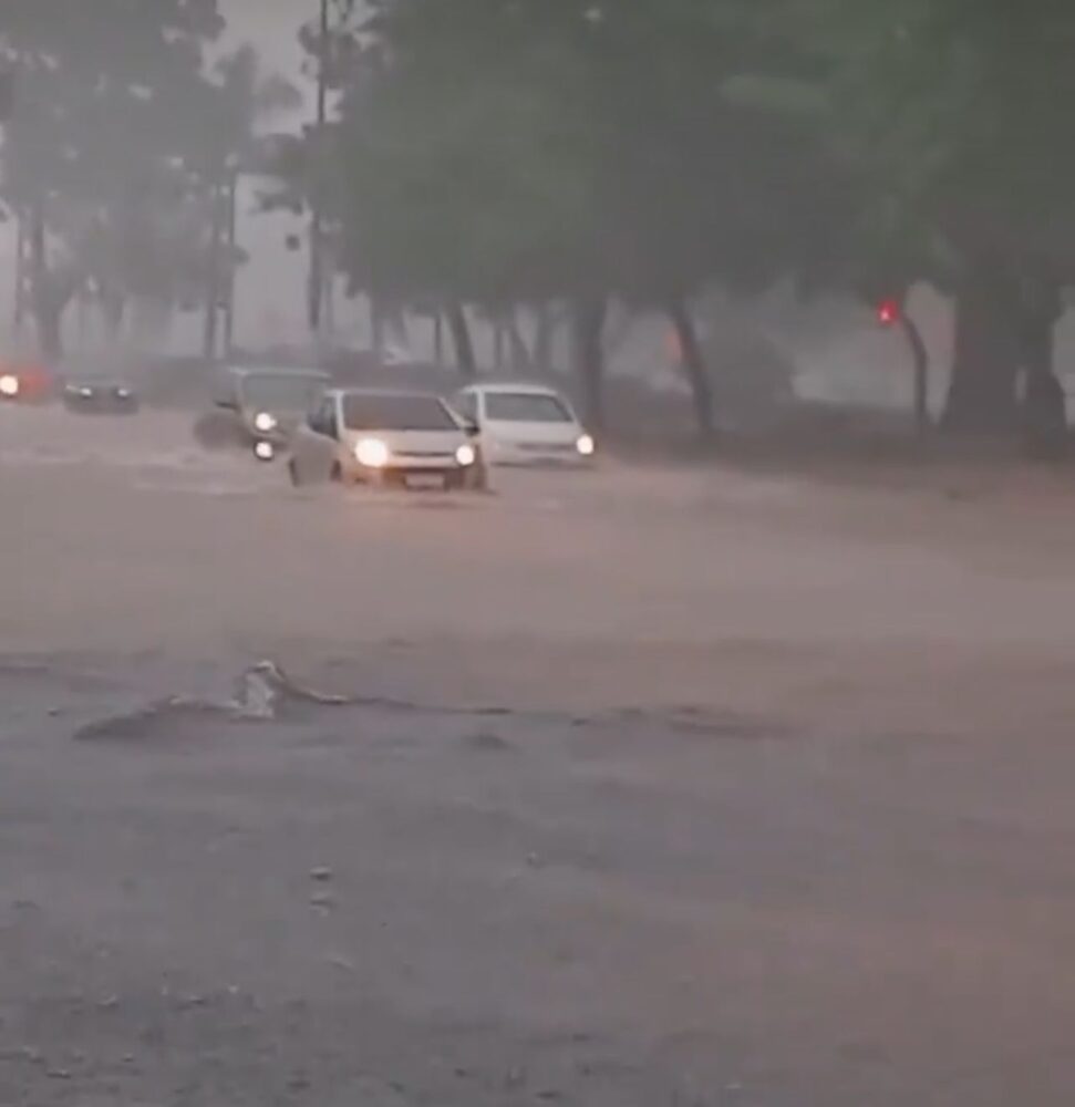 Em questão de minutos, a chuva intensa comprometeu a visibilidade das vias, tornando perigoso o tráfego nas ruas da cidade.