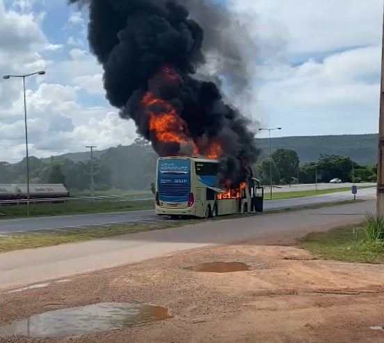 Um ônibus de viagem foi completamente tomado pelas chamas em um incêndio ocorrido na tarde desta segunda-feira (5), na BR-364, próximo a Nobres (a121 km de Cuiabá). No momento, ao menos 15 pessoas viajavam no veículo.