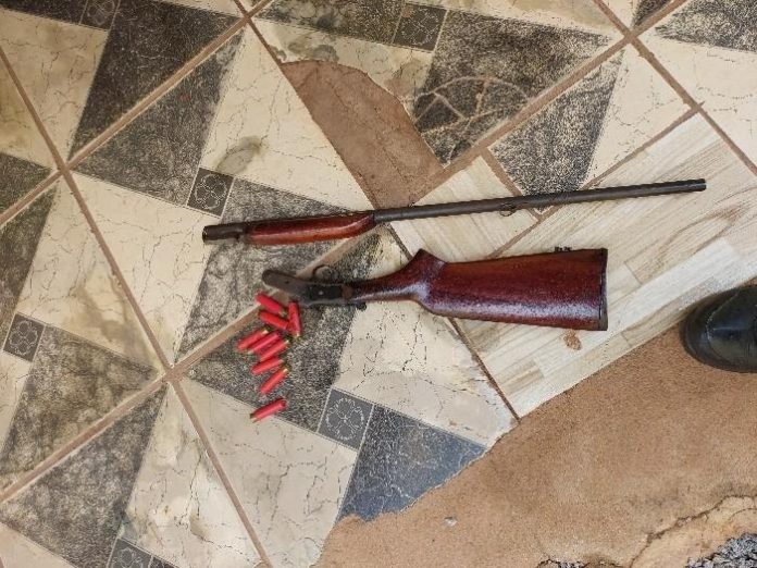 Ao chegar ao local, os policiais militares localizaram partes do que seria uma espingarda na porta de um dos quartos. Com autorização expressa da suspeita, a guarnição da polícia militar adentrou o quarto onde a mesma estava, localizando as demais partes da espingarda e algumas munições.