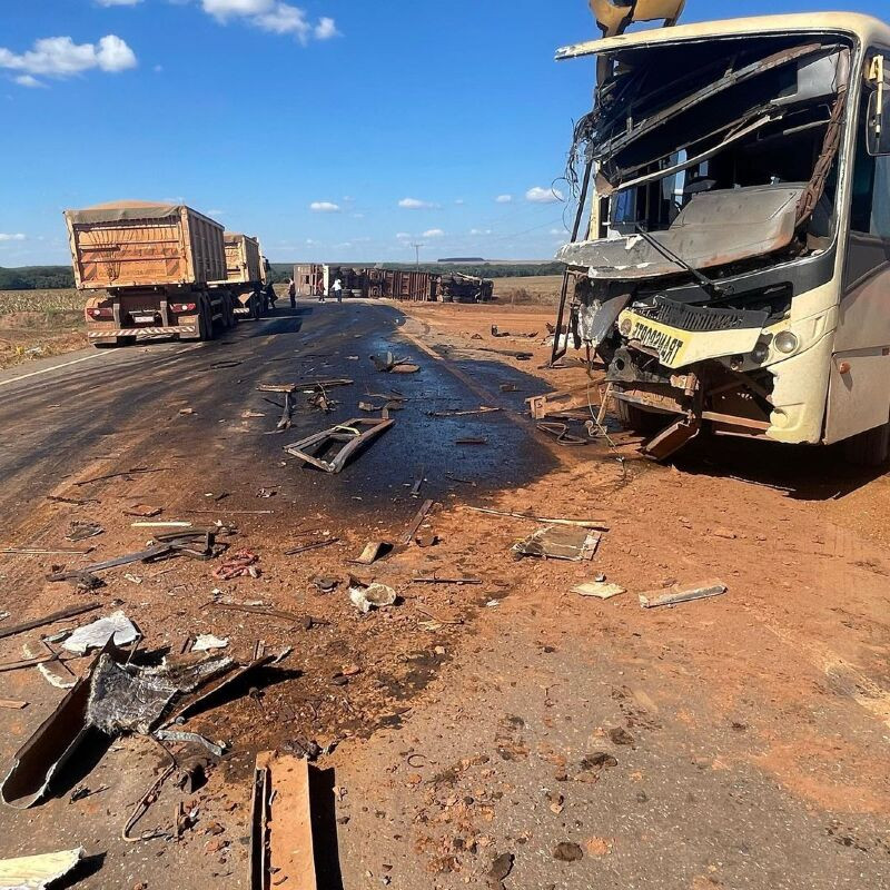 Com o impacto, a carreta perdeu o controle e tombou, trancando a pista. A frente do ônibus ficou parcialmente destruída. Apesar do susto, ninguém se feriu gravemente.