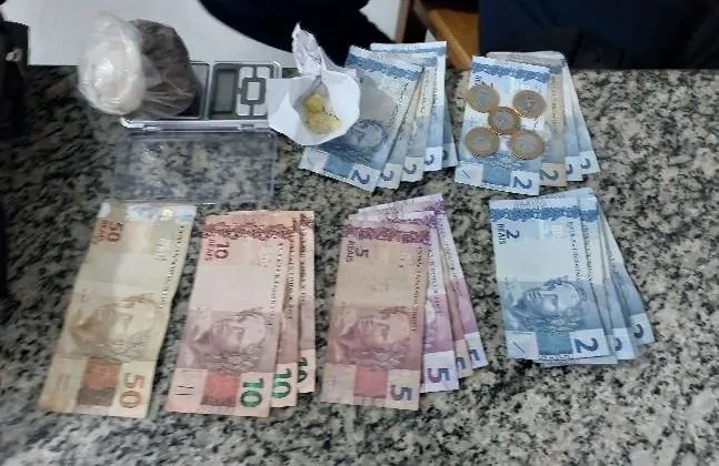 Ainda segundo a ocorrência, ambos utilizavam tornozeleira eletrônica. O homem conduzia o veículo, enquanto a mulher estava na garupa. Entre eles havia uma mochila verde, cuja posse foi assumida pela suspeita. Durante a revista, os policiais localizaram 41,1 gramas de maconha, 2,3 gramas de crack e diversas quantias em dinheiro trocado, incluindo notas de R$ 2, R$ 5, R$ 10 e R$ 50, além de moedas de R$ 1.