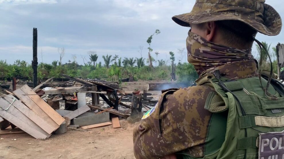 A operação Mapinguari para desocupar o Parque Guajará-Mirim (RO) completou uma semana nesta segunda-feira (21). Em sete dias, segundo balanço obtido pela Rede Amazônica, oito invasores foram presos na região e mais de 100 acampamentos foram destruídos. O Parque Guajará-Mirim tem cerca de 200 mil hectares, e a área conhecida como Bico do Parque vinha sendo destruída por constantes desmatamento e queimadas. A ação para retirada de desmatadores iniciou no dia 14 de agosto e cerca de 25 famílias deixaram imediatamente o parque, de forma voluntária. Na região já foram apreendidas armas de fogo e estruturas de rede elétrica. Durante uma semana, os agentes identificaram vários acampamentos construídos ilegalmente na área de proteção ambiental. Em alguns deles havia galinheiros e canteiros de horticultura. Cerca de 100 estruturas precisaram ser inutilizadas, sendo que na maioria dos casos foi necessário o uso do fogo para total destruição. A operação Mapinguari deve seguir até o início de setembro, mas a fiscalização e proteção da reserva estadual será permanente, segundo ressaltou Pablo Hernandez Viscardi, promotor do MP-RO e coordenador do Grupo de Atuação Especial do Meio Ambiente, Habitação, Urbanismo, Patrimônio Histórico, Cultural e Artístico (Gaema). A operação Mapinguari mobiliza ao menos 300 homens e vários órgãos fiscalizadores. De acordo com a justiça, a maioria dos invasores do parque são do distrito de Jacinópolis. A retiradas dos invasores tem o auxílio de vários órgãos, como MPRO, s Polícias Civil, Militar e Ambiental (BPA), Secretaria de Desenvolvimento Ambiental (Sedam), Agência de Defesa Sanitária Agrosilvopastoril (Idaron), Secretaria de Ação Social (Seas), Departamento de Estradas de Rodagens (DER), Bombeiros, Exército Brasileiro, servidores da Secretaria de Assistência Social e Tribunal de Justiça de Rondônia (TJ-RO). Gado livre Em um sobrevoo realizado na semana passada, a reportagem da Rede Amazônica flagrou dezenas de hectares desmatados e gado circulando livremente no Parque Estadual Guajará-Mirim. As imagens do alto mostram várias clareiras e um rastro de destruição da natureza. Em uma das áreas é possível ver toras de madeira que não foram totalmente destruídas após a ação das queimadas (veja abaixo). Em uma semana de operação, mais de 2 mil bovinos foram encontrados transitando no parque, apenas nos primeiros dias da operação Mapinguari. De acordo com a Idaron e governo de Rondônia, o gado está sendo retirado do parque, mas não apreendido. “Não há apreensão de nenhum animal das fazendas fiscalizadas, sendo realizado tão somente procedimentos administrativos, de reunião e conferência dos animais, considerando a constatação de movimentação do rebanho sem documentação”, afirmou em nota. O estado também reiterou que as pessoas que estavam sem autorização na área “foram autuadas, por conta da falta de documentação pertinente quanto ao trânsito dos animais, bem como pelos órgãos de fiscalização ambiental da operação”.
