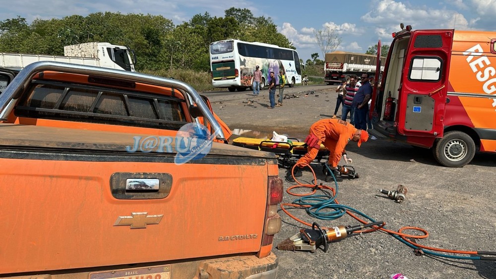 Na tarde desta segunda-feira (21), um grave acidente ocorreu na BR 364, nas proximidades do perímetro urbano de Jaru, no trecho próximo ao Antigo Balneário Primavera. Uma caminhonete S10, que seguia em direção à cidade de Jaru, teve um dos pneus estourado, o que fez o motorista perder o controle do veículo, colidindo frontalmente com uma carreta que trafegava no sentido contrário, rumo a Ouro Preto do Oeste.