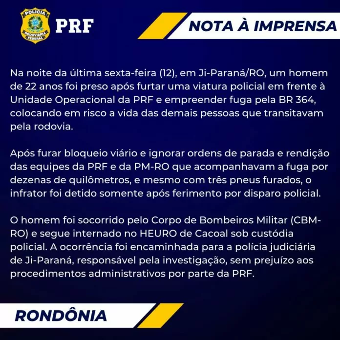 Na noite da última sexta-feira (12), um jovem de 22 anos foi detido após furtar uma viatura da Polícia Rodoviária Federal (PRF) em Ji-Paraná, Rondônia. O incidente ocorreu em frente à Unidade Operacional da PRF, quando o indivíduo aproveitou um momento de distração dos policiais e conseguiu entrar no veículo oficial, fugindo em alta velocidade pela BR-364.