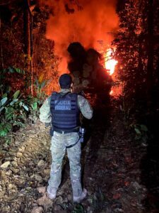 A Polícia Federal contou com os trabalhos de quinze polícias federais treinados para atuar em ambiente de selva, além dos servidores do Ibama.
