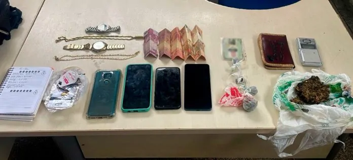 A varredura minuciosa realizada pelos policiais revelou ainda uma balança de precisão, uma caderneta com anotações típicas do tráfico, além de quatro trouxinhas de substância análoga à maconha. Objetos de procedência duvidosa também foram apreendidos.