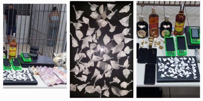 Durante a busca pessoal, os militares encontraram 10 invólucros de substância análoga à cocaína e uma quantia em dinheiro trocado. Na sequência, foi realizada uma revista na residência, onde foram localizados outros invólucros da mesma droga, além de celulares, notebooks, bebidas alcoólicas e cigarros de procedência duvidosa.