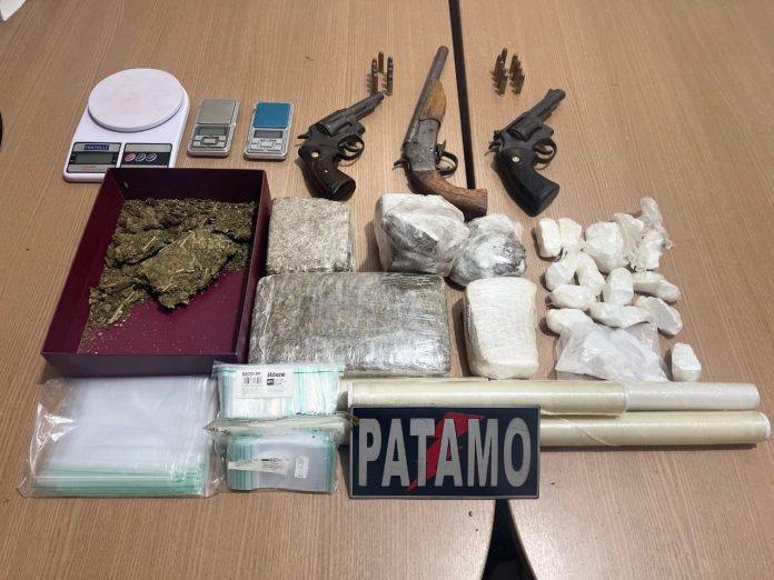 Durante as buscas, foram encontradas mais uma arma de fogo tipo garrucha, 407 gramas de crack, 450 gramas de cocaína, 2,249 quilos de maconha, cinco rolos de papel filme, embalagens plásticas utilizadas para acondicionar entorpecentes, três balanças de precisão e outros objetos relacionados ao tráfico.