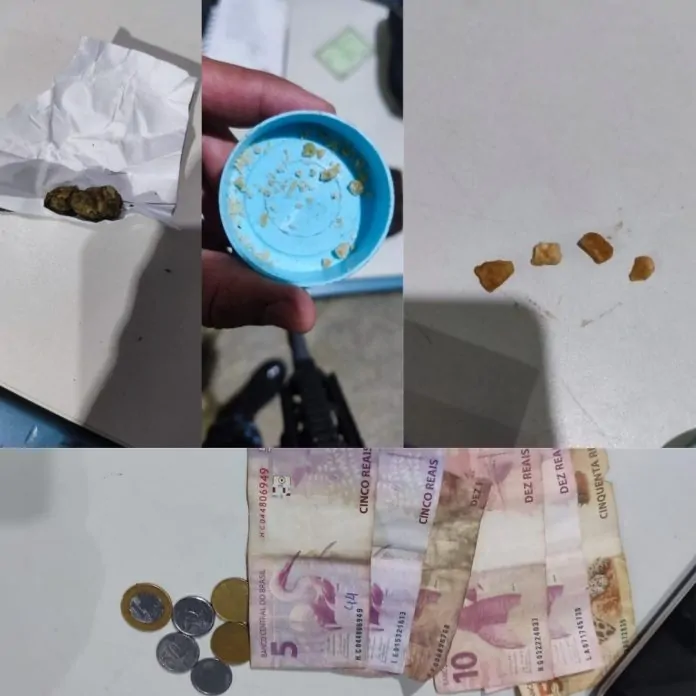 Durante a revista pessoal, foram encontrados com os suspeitos R$ 107,00 em espécie e, um pote de mentos contendo farelos de crack, uma caderneta com possíveis anotações de vendas de drogas.