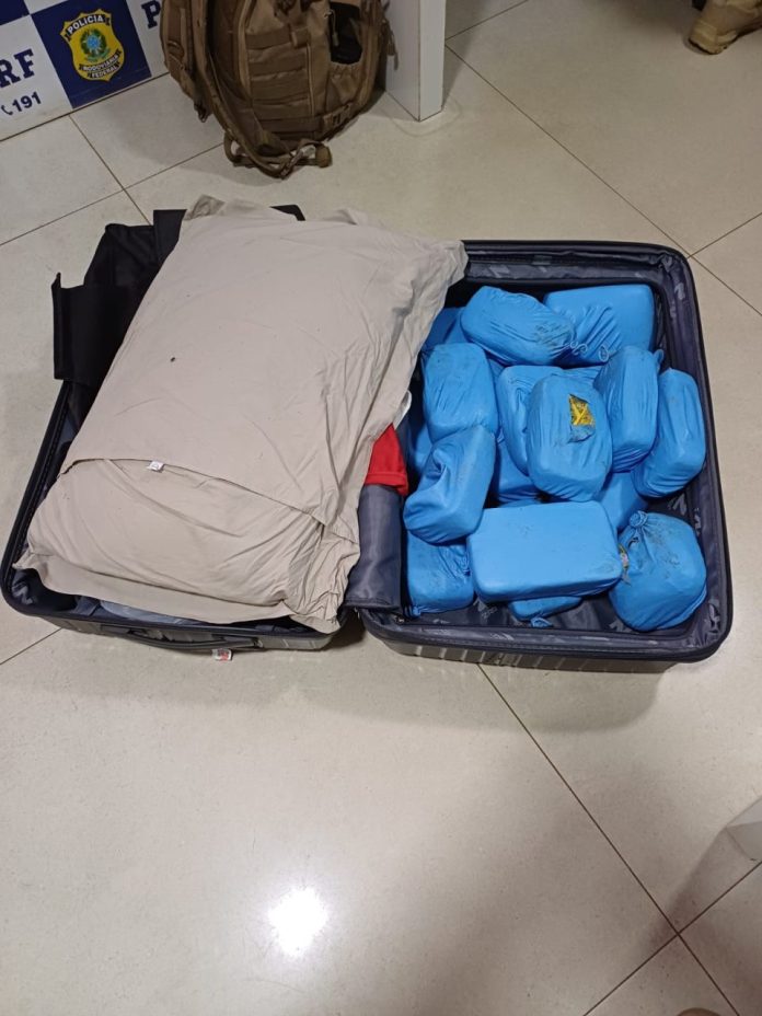 Em uma mala de viagem, os agentes encontraram diversos tabletes contendo pasta base de cocaína, totalizando 20,5 quilos da substância ilícita.