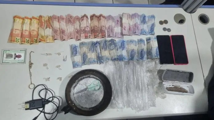 A guarnição localizou e abordou os outros dois homens indicados. Com um deles, foram apreendidos R$ 154 em dinheiro e dois invólucros com a mesma substância. O segundo portava quatro invólucros de droga, um aparelho celular e R$ 70 em espécie. Próximo ao local da abordagem, os policiais também encontraram materiais usados na preparação e fracionamento de entorpecentes.