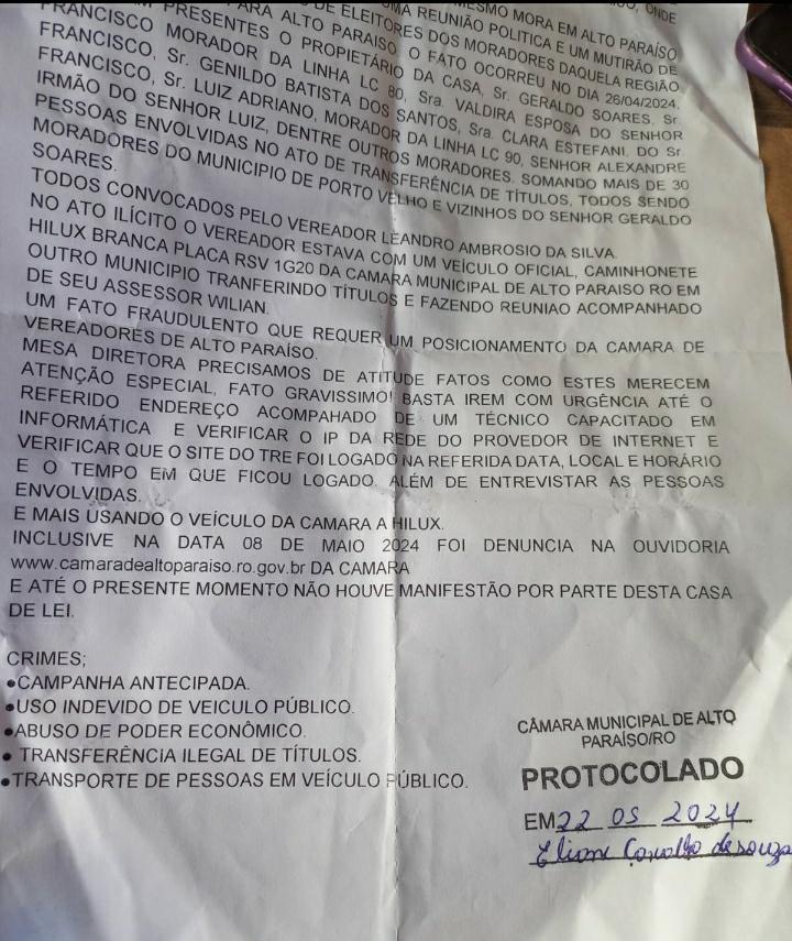 O vereador Leandro Ambrósio da Silva (PL) residente em Alto Paraíso, foi acusado de organizar um mutirão para transferência de títulos eleitorais dos moradores de Porto Velho para Alto Paraíso. Segundo a denúncia, mais de 30 pessoas participaram do evento, incluindo moradores locais e vizinhos de Geraldo Soares. Entre os presentes estavam Francisco, morador da Linha LC 80, sua esposa Valdira, Genildo Batista dos Santos, Clara Estefani, Luiz Adriano, morador da Linha LC 90, e Alexandre, irmão de Luiz Adri
