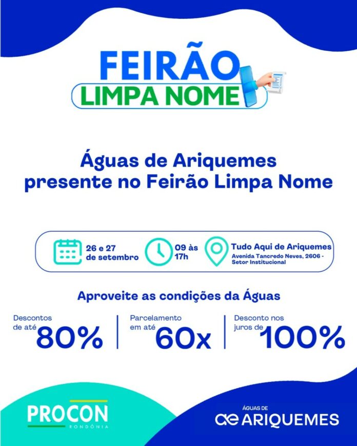 A concessionária Águas de Ariquemes, participará do ‘Feirão Limpa Nome’ realizado pelo Programa de Proteção e Defesa do Consumidor de Rondônia (Procon), em Ariquemes. O feirão acontece nos dias 26 e 27 de setembro, das 9h às 17h, no Tudo Aqui Ariquemes.