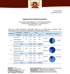 Um levantamento de opinião eleitoral realizado em 15 municípios de Rondônia revela diferentes cenários para um eventual segundo turno das eleições presidenciais de 2026, com destaque para a vantagem do presidente Luiz Inácio Lula da Silva em duas simulações e liderança do senador Flávio Bolsonaro em confronto direto contra o governador Ronaldo Caiado.