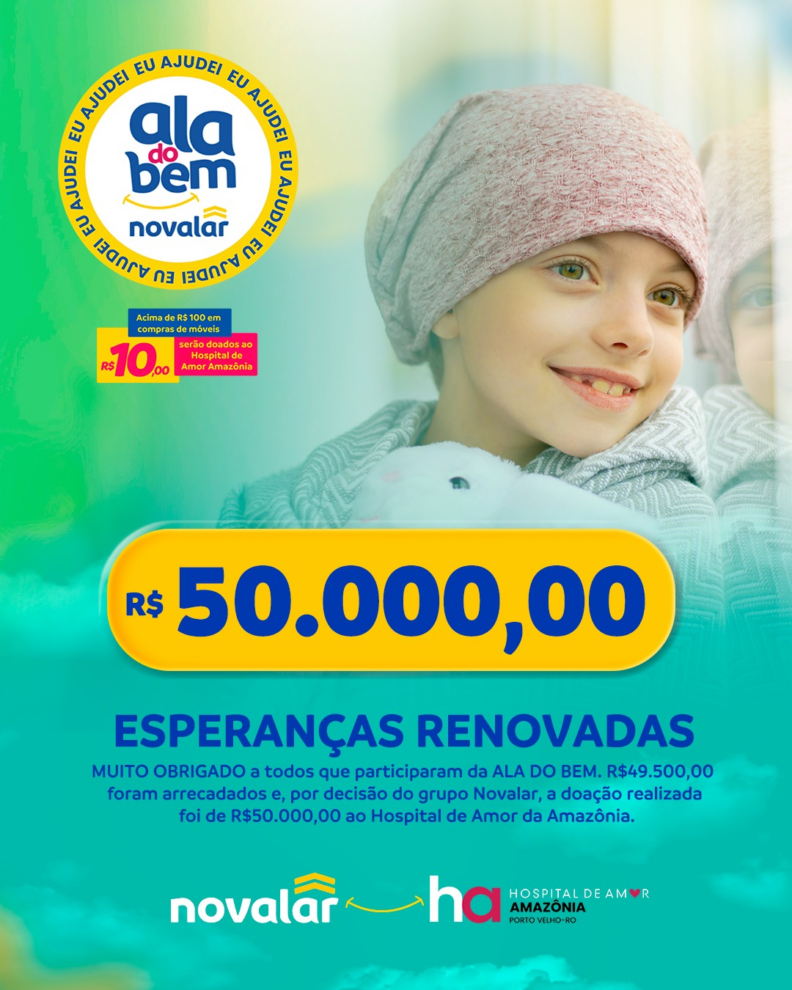 A Novalar, uma das maiores empresas de móveis e eletrodomésticos de Rondônia, acaba de realizar um antigo sonho: organizou uma grande campanha social que pudesse ajudar muitas pessoas no estado. Para isso, gestores e colaboradores criaram a campanha ALA DO BEM NOVALAR, que teve o objetivo de reverter parte da venda de móveis ao Hospital de Amor da Amazônia para contribuir financeiramente com os serviços de prevenção ao câncer, tratamento e reabilitação praticados pelo Hospital.